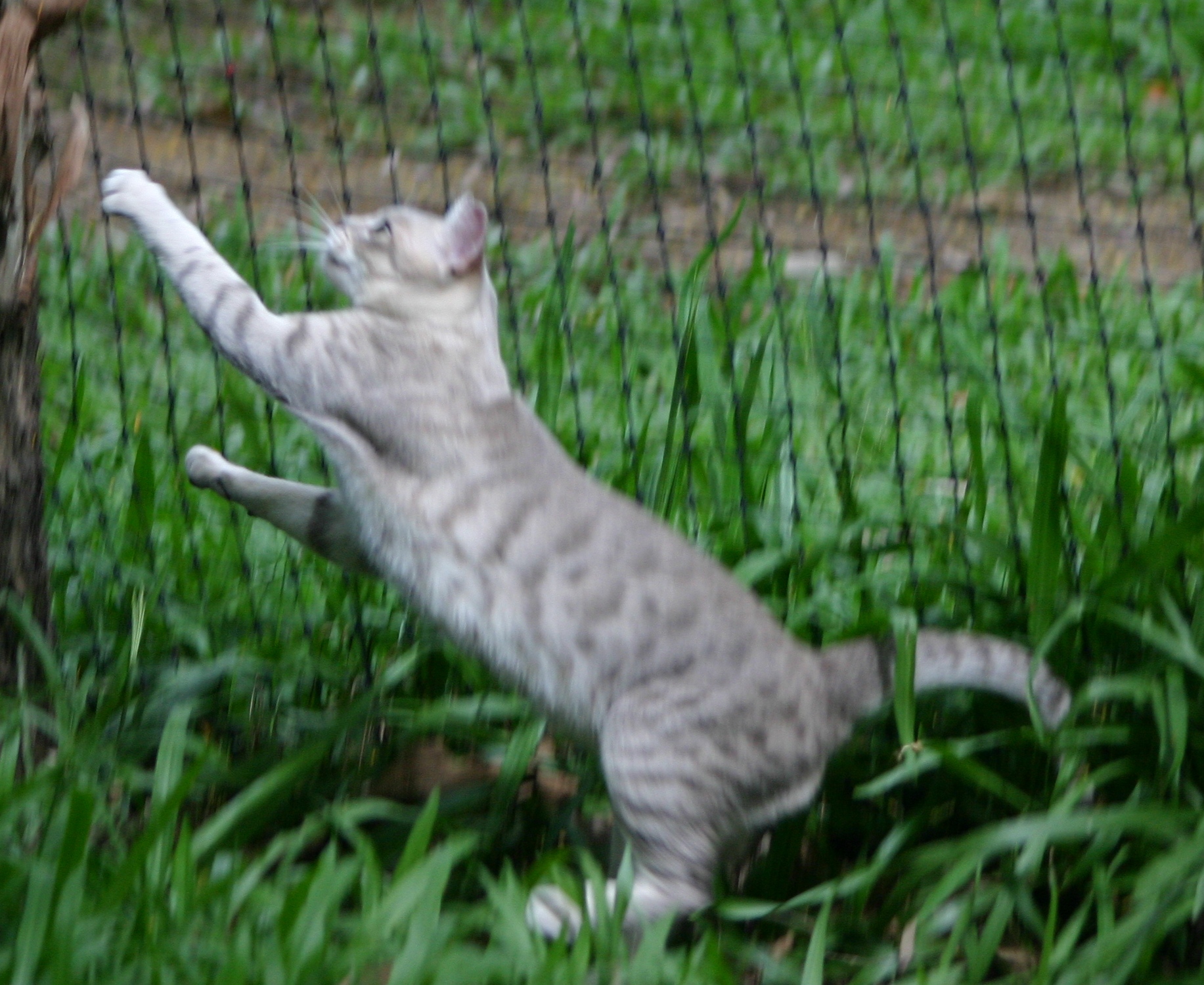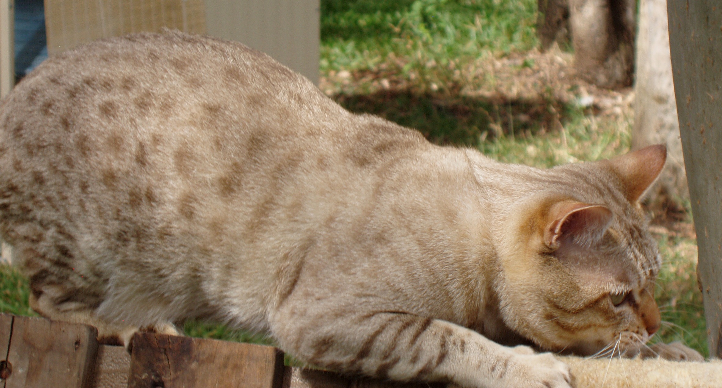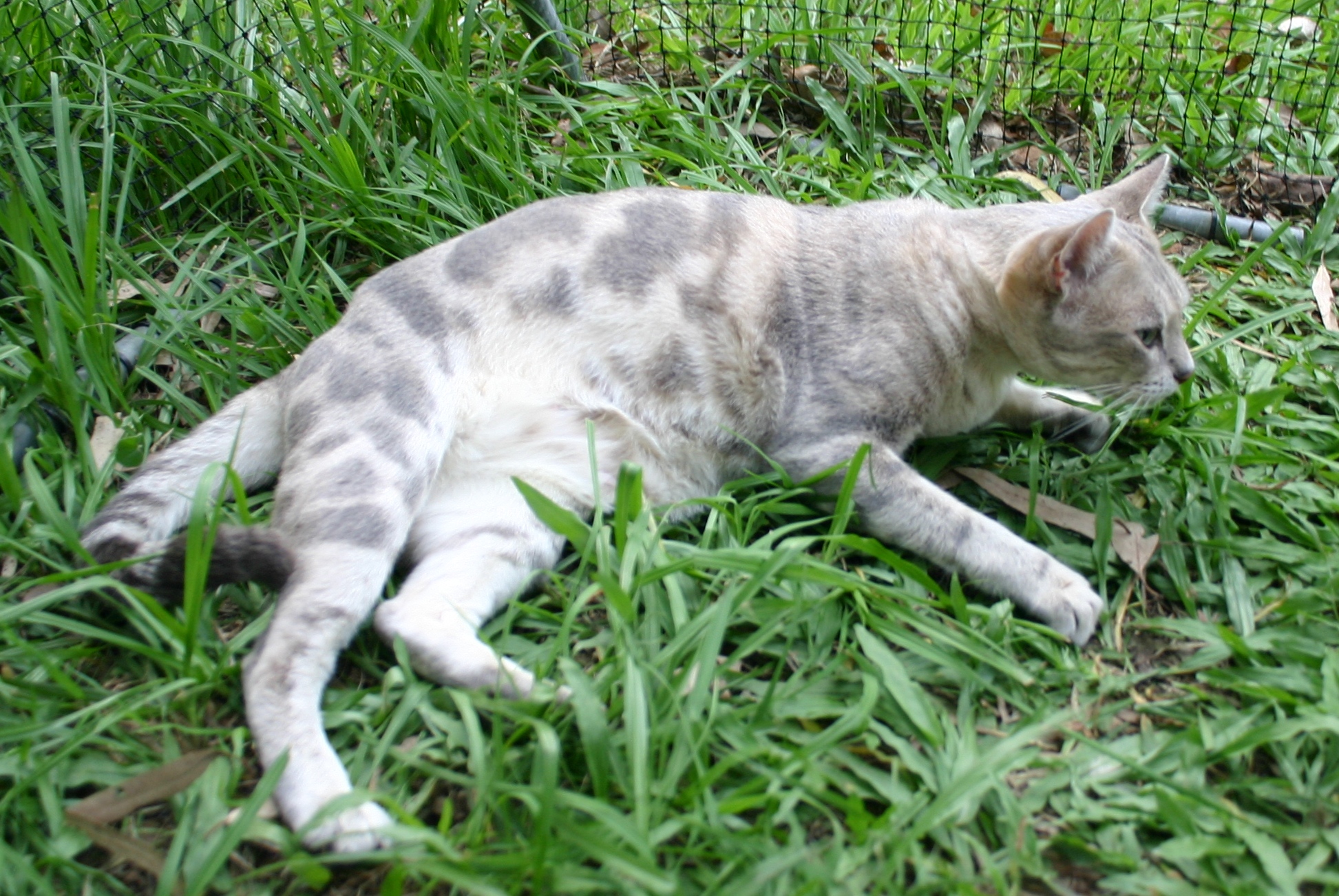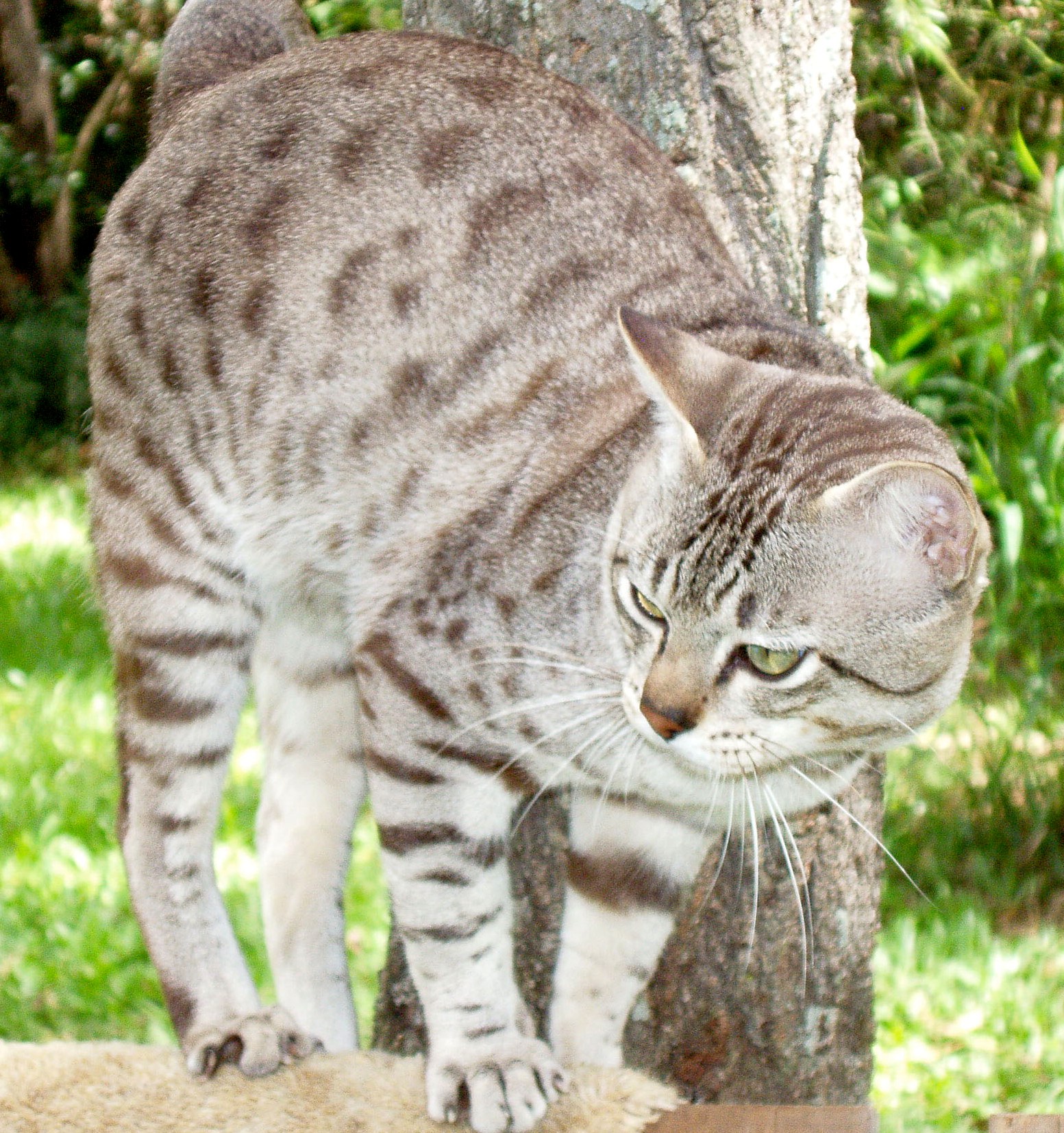 COAT PATTERN:SPOTTEDAn unbroken line runs back from the corner of the eye to meet a broken line running from the corner of the mouth. Markings on the forehead form an intricate letter M, and extend as lines over the top of the head to the shoulder region. Several broken/unbroken necklaces on neck and upper chest. Spine line/s broken or unbroken, no penalty. Body markings symmetrical spots of any size or shape over sides, flanks and belly. Elongated spots, or banding on the legs permissible. Tail evenly ringed, with a solid tip. Paws may be spotted above, undersides of the pattern colour. MARBLED
