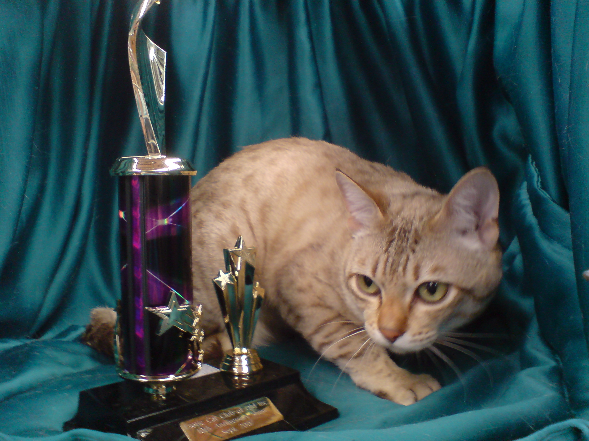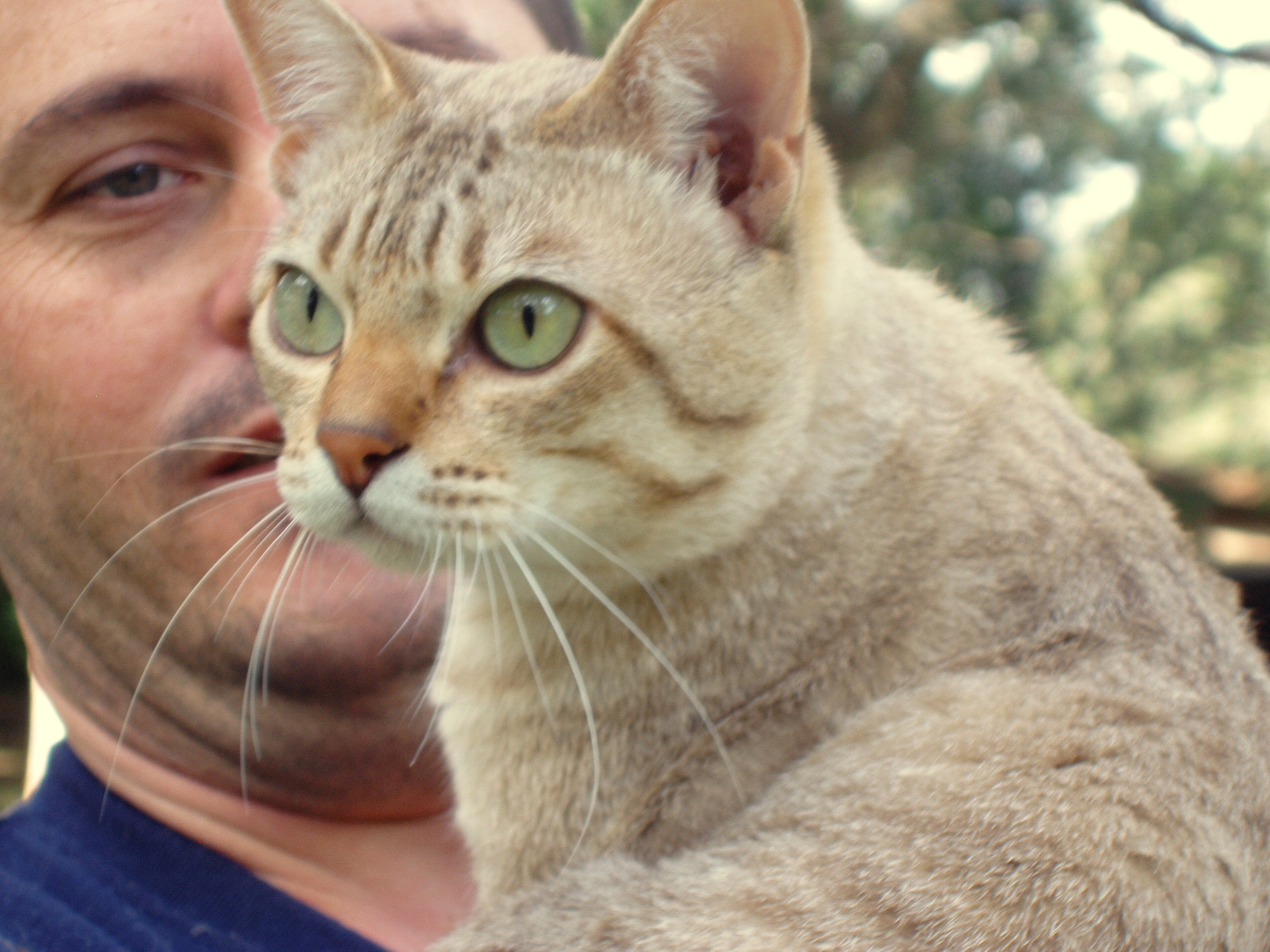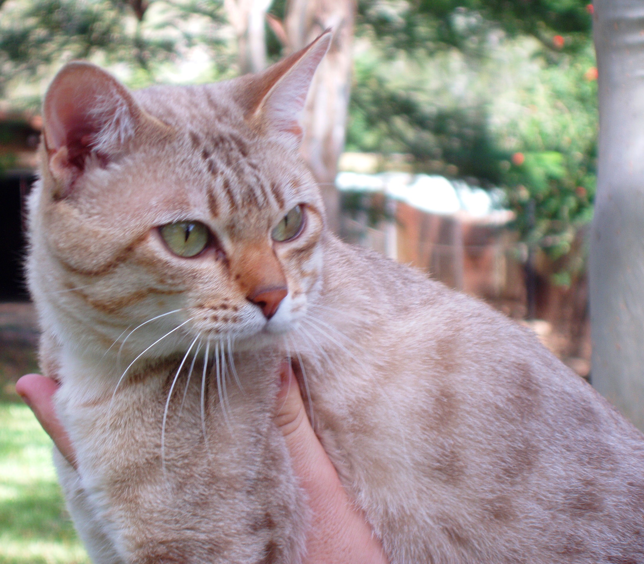 The Australian Mist is a well-balanced, gently contoured cat of moderate foreign type, with no tendency to extremes in any characteristic. Both males and females have well sculpted facial features creating an open, generous expression. The males may be slightly larger than the females with facial characteristics and musculature more developed. Muscle development, coat and eye colour achieve adult expression by two (2) years of age.