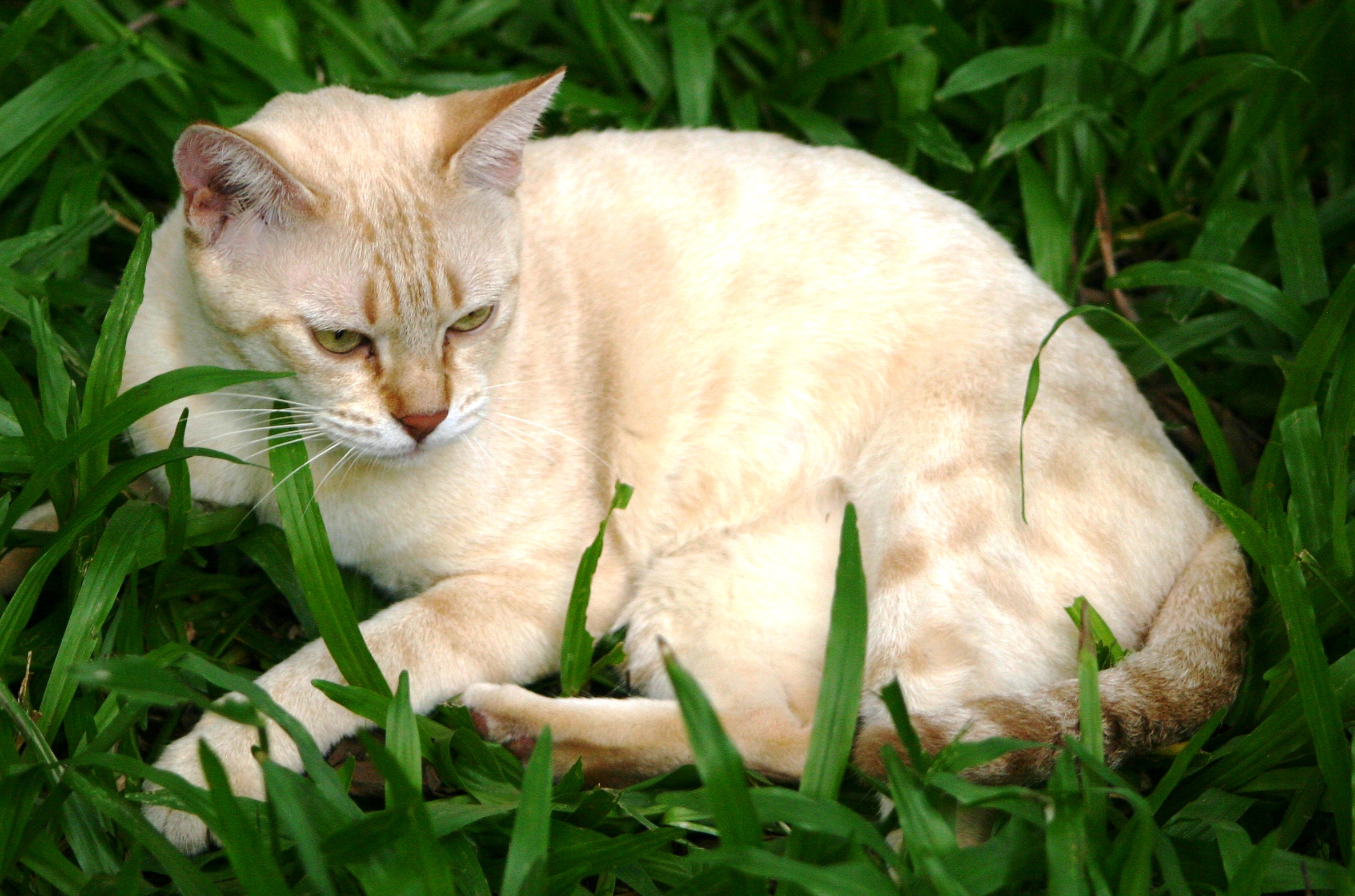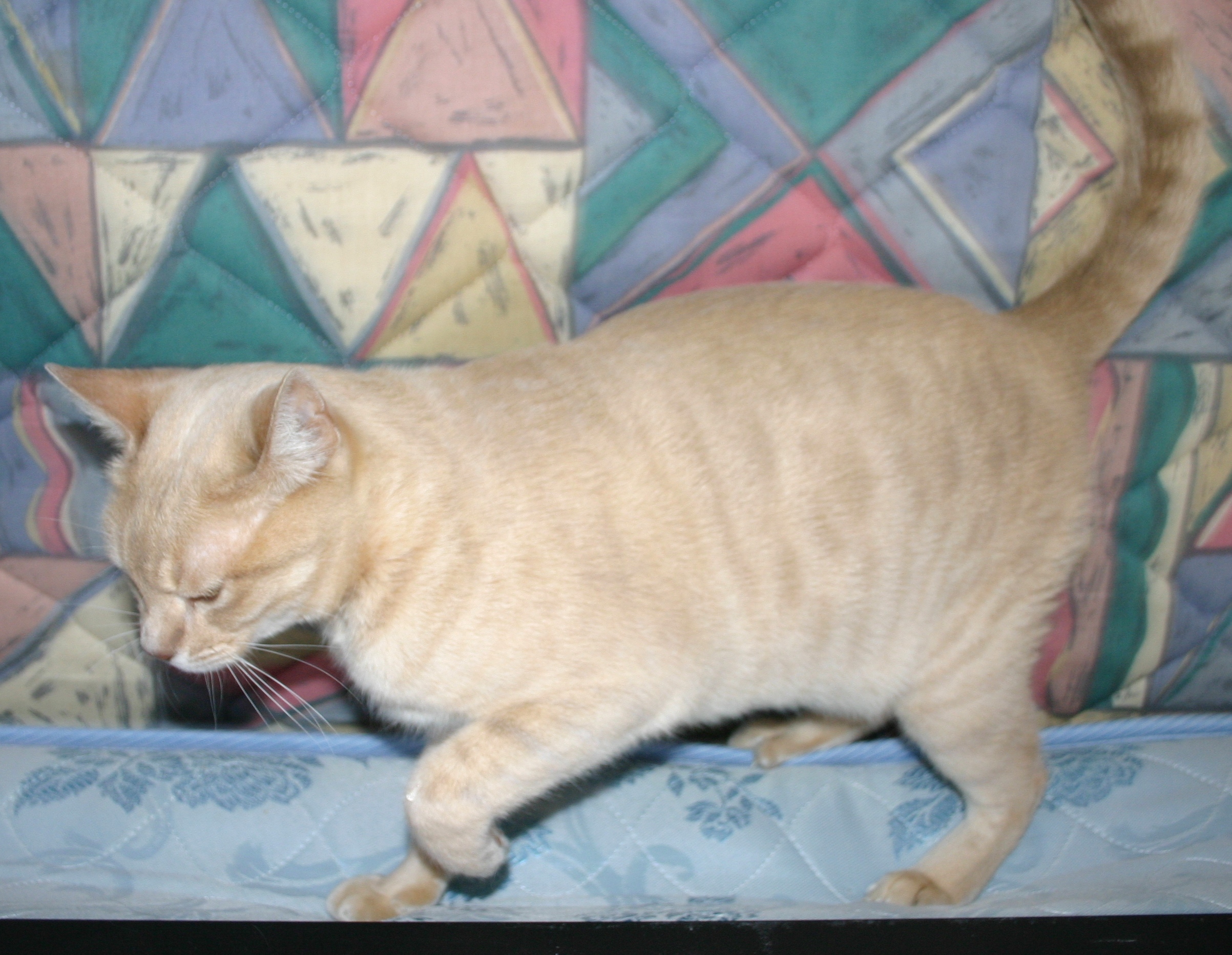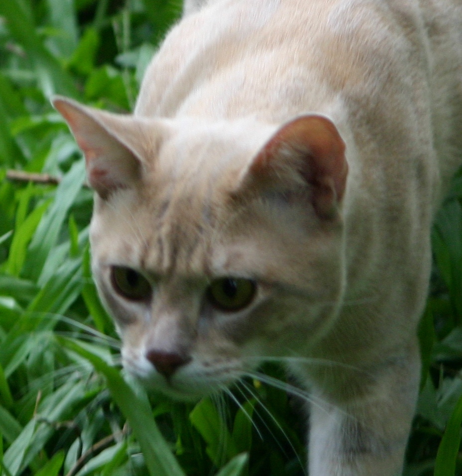 Pinkish-salmon markings against a pinkish-cream ground. Ear tips, top of head and back brushed with a faint lilac bloom.