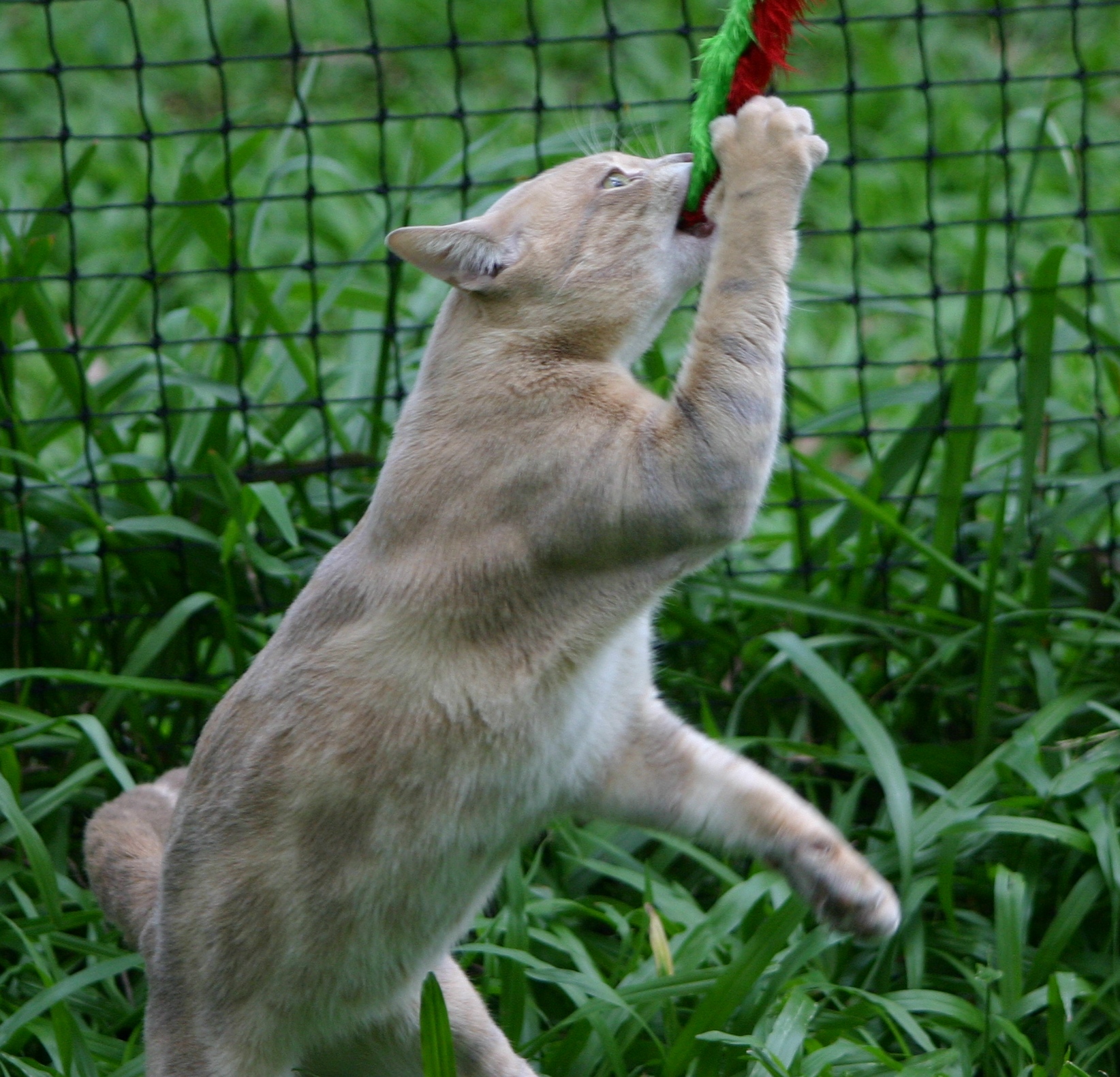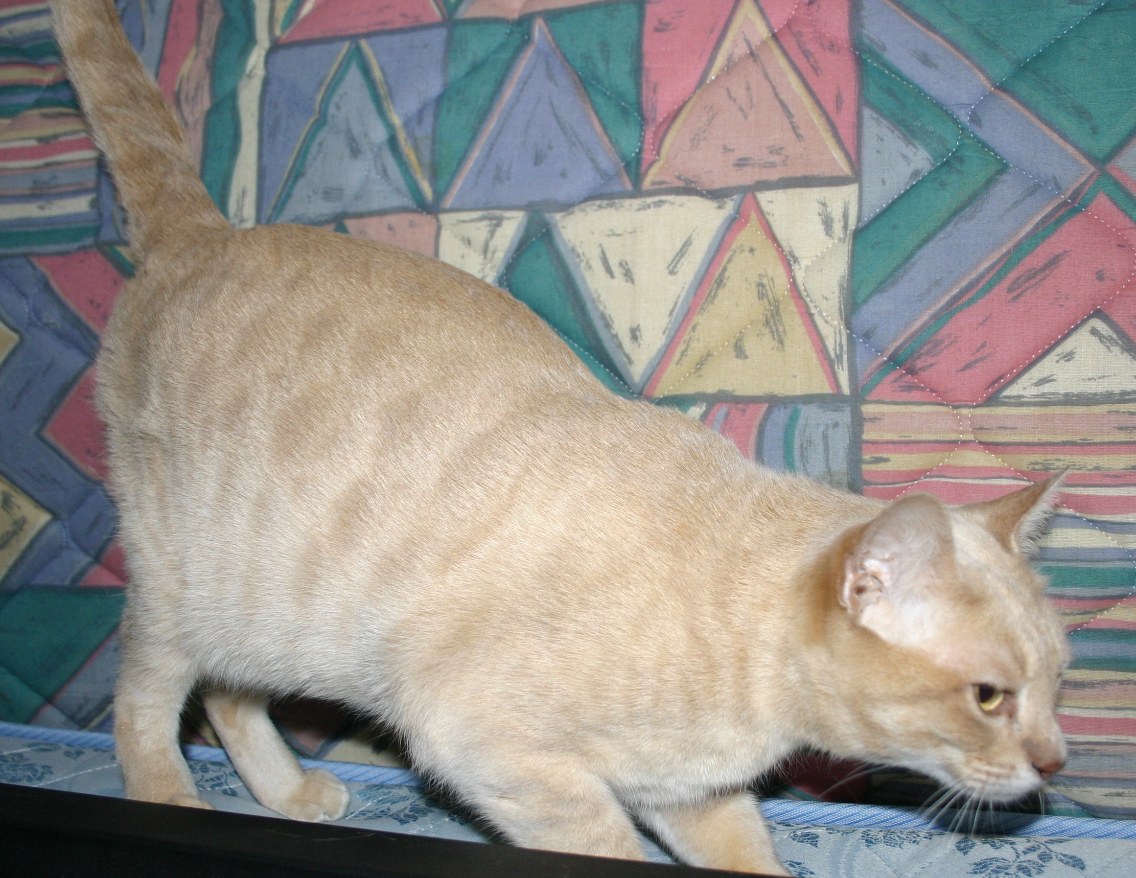 BODY: Medium in length, hard and muscular, heavier than it appears; chest broad and round.TAIL: Length in balance with the body, thick, minimal taper, well furred.LEGS: Proportionately strong, hind legs slightly higher than forelegs.PAWS: Neat and oval. |